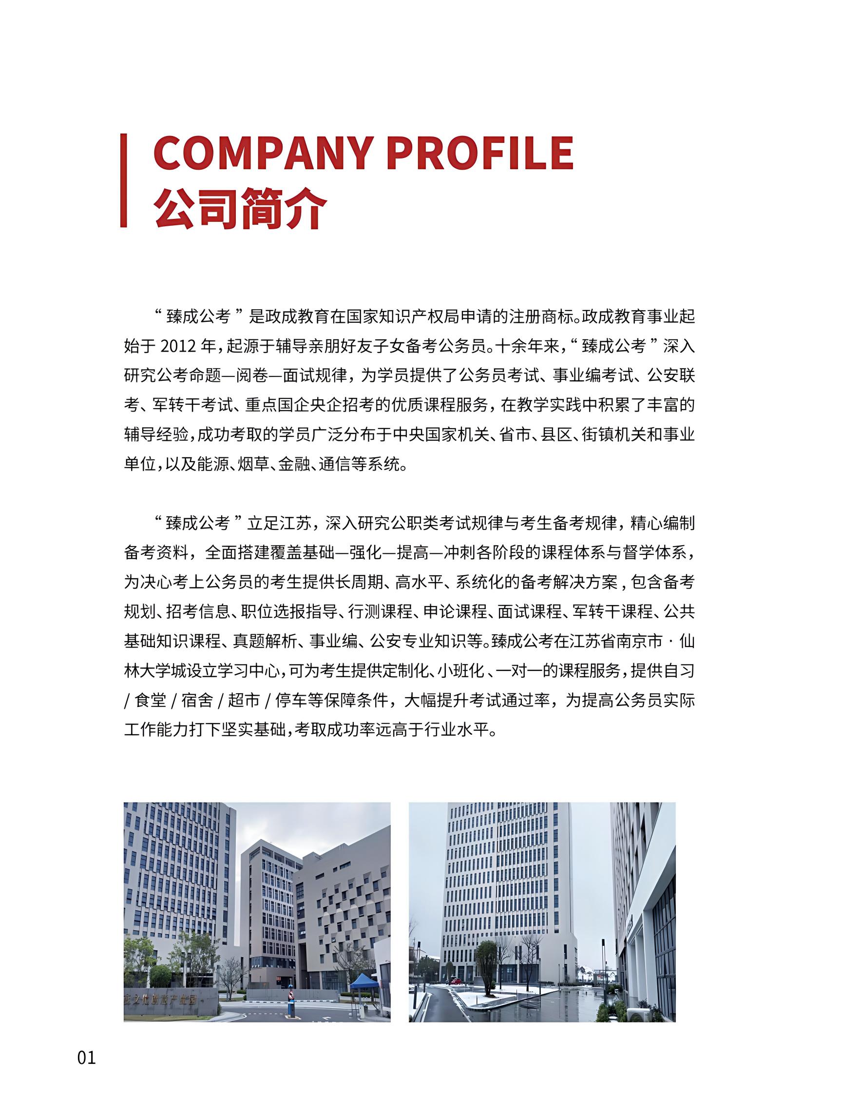 “臻成公考”立足江苏,深入研究公职类考试规律与考生备考规律,精心编制备考资料,全面搭建覆盖基础一强化一提高一冲刺各阶段的课程体系与督学体系,为决心考上公务员的考生提供长周期、高水平、系统化的备考解决方案,包含备考规划、招考信息、职位选报指导、行测课程、申论课程、面试课程、军转干课程、公共基础知识课程、真题解析、事业编、公安专业知识等。臻成公考在江苏省南京市·仙林大学城设立学习中心,可为考生提供定制化、小班化、一对一的课程服务,提供自习/食堂/宿舍/超市/停车等保障条件,大幅提升考试通过率,为提高公务员实际工作能力打下坚实基础,考取成功率远高于行业水平。